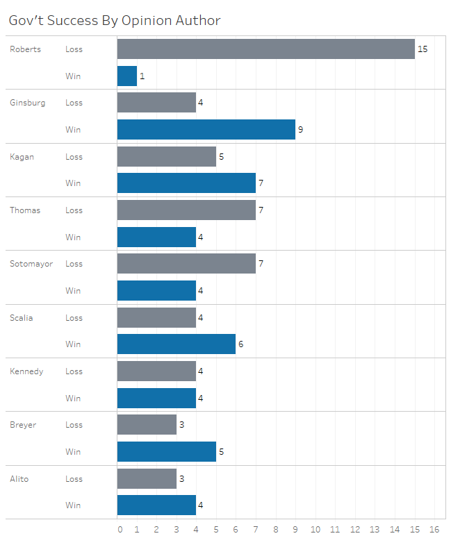 In cases involving an OSG merits brief and authored by Chief Justice Roberts since 2012, the government lost fifteen of sixteen decisions. Losses include high profile cases such as Shelby County v. Holder as well as lesser known decisions. This may be an ominous sign for important future government decisions as the Court has ruled against both democrat (under Obama) and republican (under Trump) agenda items. On the other end of the spectrum, the government has been most successful when Justice Ginsburg is the majority opinion author.