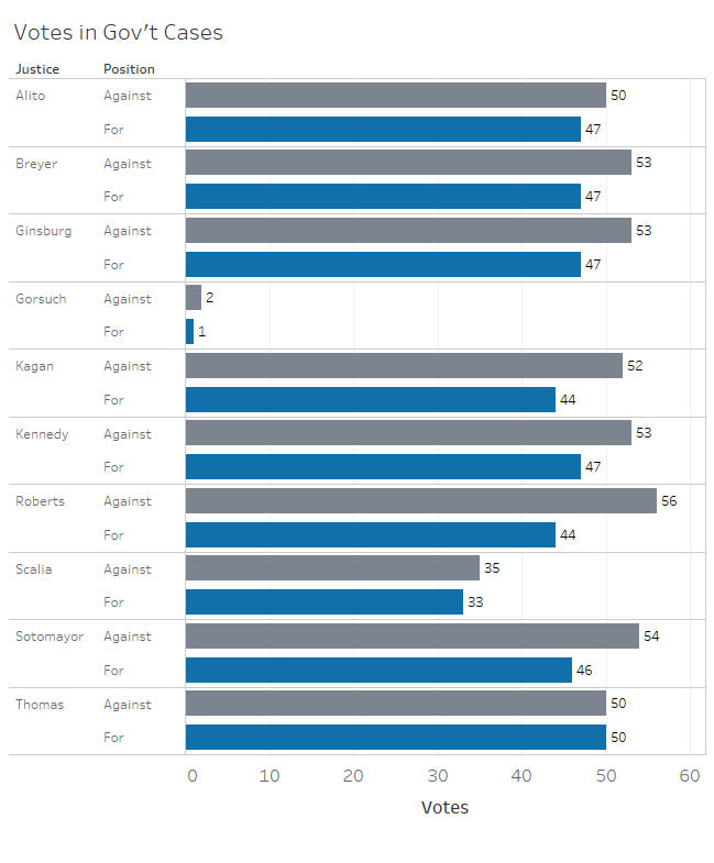 As with Chief Justice Roberts’ votes in cases involving the OSG, the justices in general display mixed and sometimes unpredictable behavior when the OSG litigates a case. Looking at the justices’ votes for and against the government’s positions in these cases Chief Justice Roberts has also voted against the government’s positions more frequently than any of the other justices.