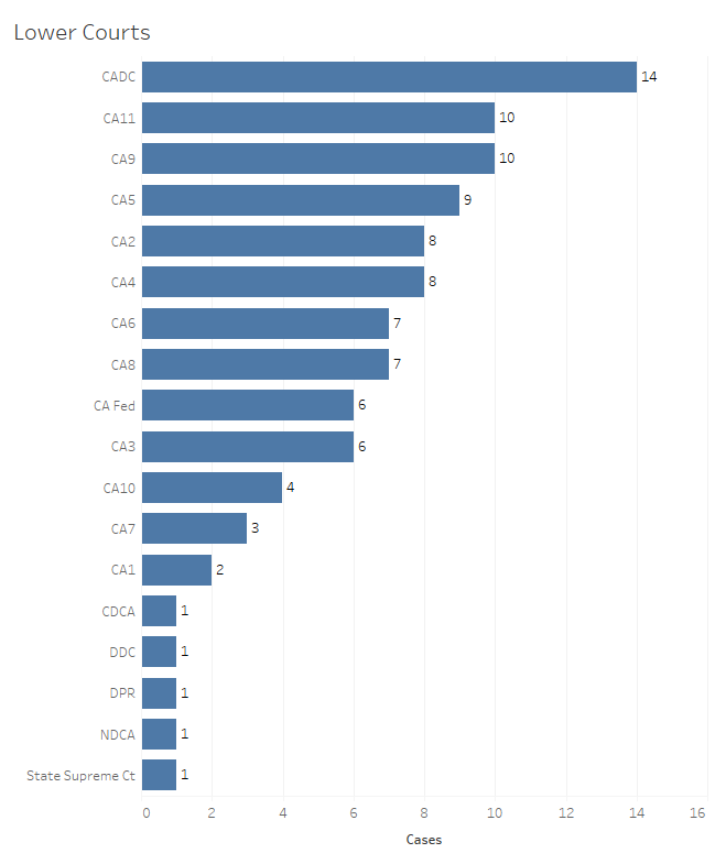 Although more cases come from the Ninth Circuit than from any other lower court, the bulk of these cases come from the D.C. Circuit. This is logical, though, since many of the government’s cases arise in the District of Columbia. The Ninth Circuit is tied with the Eleventh Circuit for the second most cases in this set. Of the federal appeals circuits, the fewest such cases came from the First and Seventh Circuits. Cases also came to the Supreme Court from several district courts (these are often election/voting related cases).