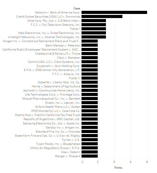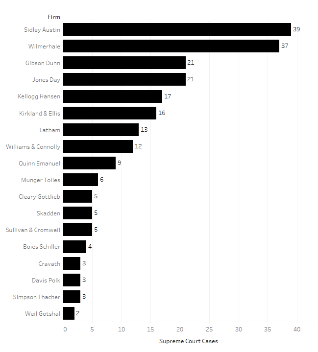 Sidley Austin led the pack with 39 cases followed closely by WilmerHale with 37 cases. Two other firms with large Supreme Court involvement, Gibson Dunn and Jones Day came next.