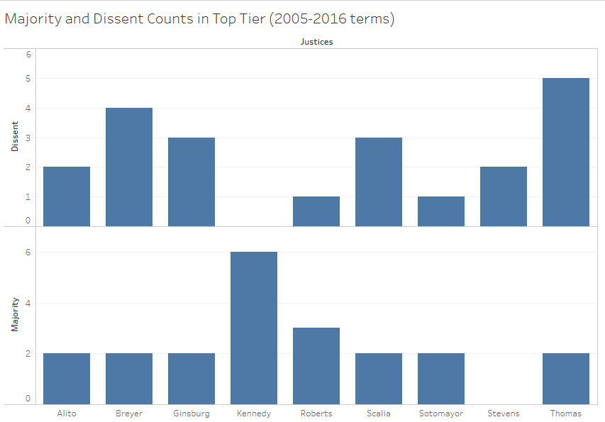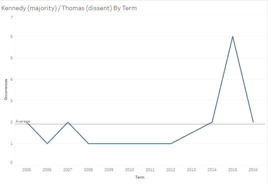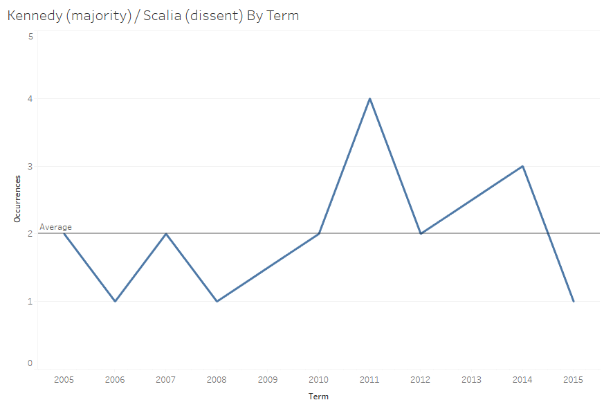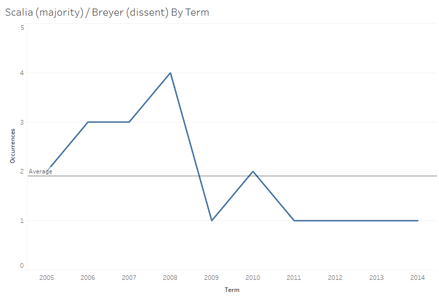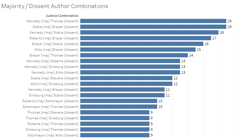 If ideology was the main factor at play then we might expect a Thomas/Ginsburg, Thomas /Sotomayor, Scalia/Sotomayor, or Scalia/Ginsburg pair atop the field. None of these pairs are towards the top of the initial graph though, while five pairs including Justice Kennedy as majority author are in the top ten for most dissents. Justice Kennedy has been the Court’s ideological median vote, however, for many years now. In terms of dissents, one might expect Justice Thomas to be the leader given his recent history of high dissent counts. Justice Breyer, however, is the dissenting justice in more top ten pairs with three compared to Justice Thomas with two.