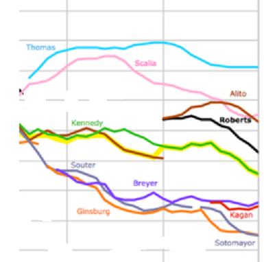 What drives these pairs? At first look it doesn’t appear that ideology in isolation is the main factor. Martin and Quinn Scores presented in the graph below show the justices’ ideologies from most conservative (the higher lines) to most liberal (the lower lines).