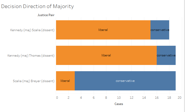 While ideology does not tell the entire story, perhaps it still does play a meaningful role. When looking at the decision direction of the majority (as coded in the Supreme Court Database) for all cases in the top three pairs (Kennedy/Scalia, Kennedy/Thomas, and Scalia/Breyer) ideology seems to be a motivating factor in the justices’ choices.