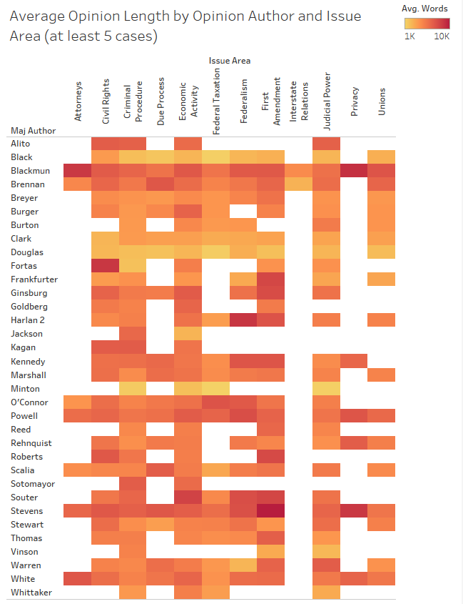 Looking at the justices with a finer toothed comb, the next figure breaks down average opinion length by justice and by the general case area. This figure only focuses on instances where justices authored at least five majority opinions in a given issue area.
