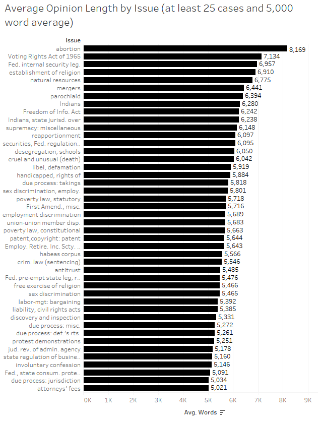 The difference in majority opinion size is also evident when clustering opinions by certain characteristics. Using the Supreme Court Database, I grouped opinions according to coding by issue. To ensure the correlations were not based on idiosyncratic instances I only used issues coded in at least 25 cases. Issues with opinions that averaged at least 5,000 words are displayed below.