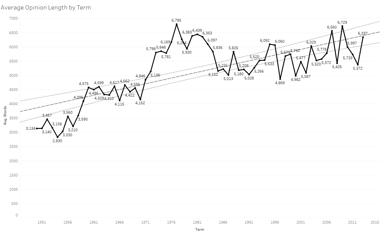 As this graph shows, the mean majority opinion length steadily increased from under 4,000 words to over 6,000 words across this period.