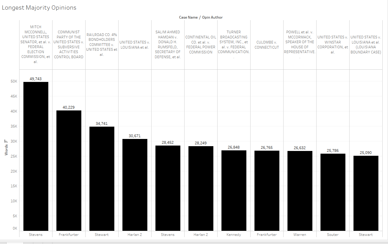 Only two signed opinions, those in McConnell v. FEC and Communist Party v. Subversive Activities Control Board, were over 40,000 words long. This also shows that opinions closer to 25,000 words were much more common than much longer ones. Two Louisiana boundary opinions are both in the top 11. Justice Stevens, the justice with the longest opinions on average has two in this figure with McConnell and Hamdan v. Rumsfeld. Interestingly, so do justices Frankfurter, Harlan, and Stewart. The only sitting justice with an opinion in this figure is Justice Kennedy with his opinion in TBS v. FCC.