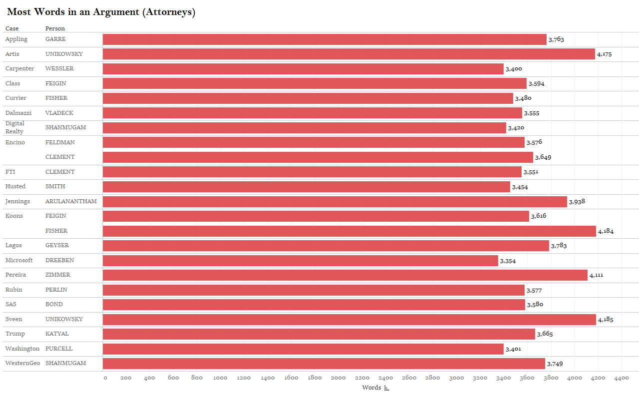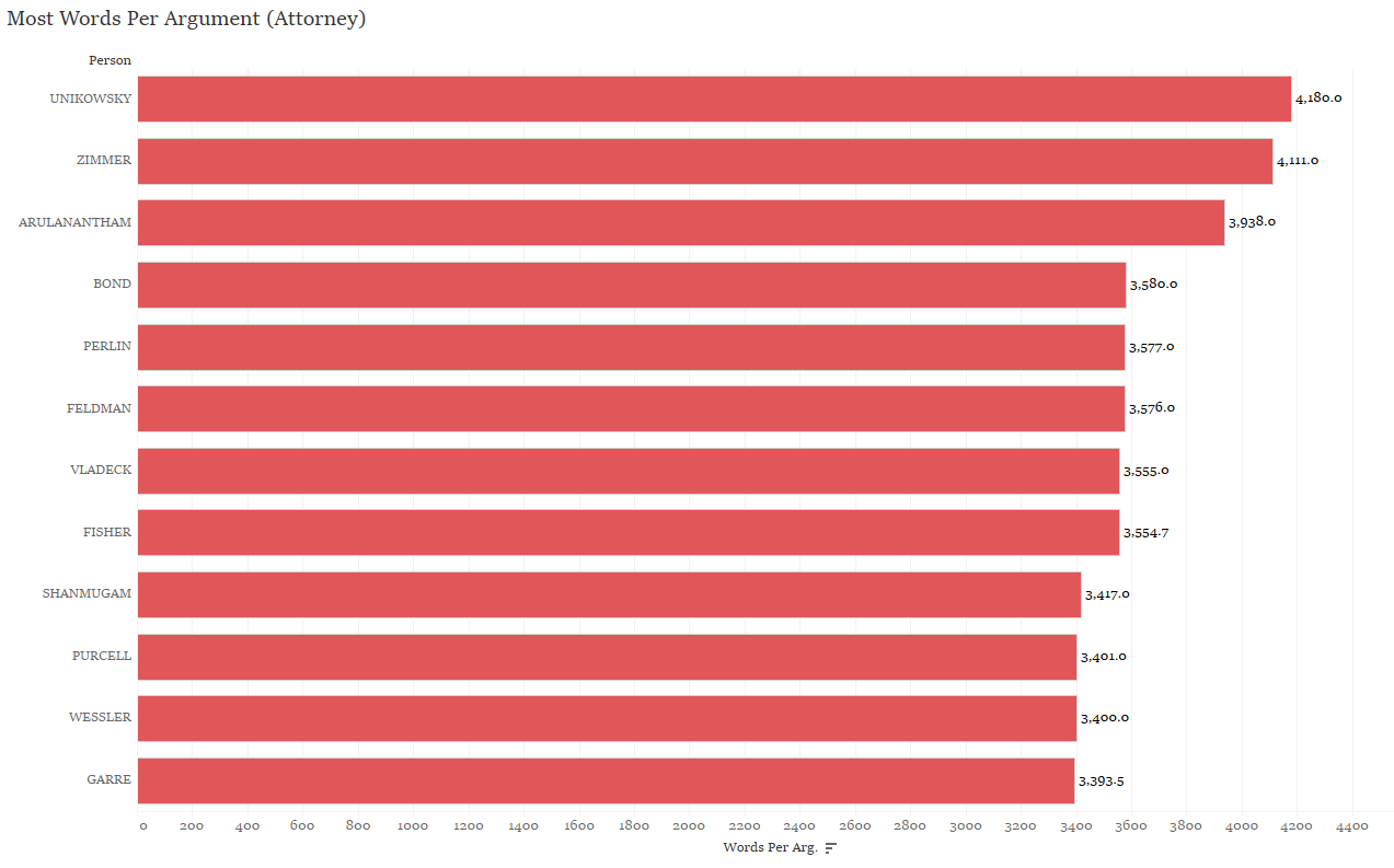 Examining the participation of attorneys in a bit more detail, we can gather more information about their involvement at the case level. Below are the attorneys that spoke the most words per argument.