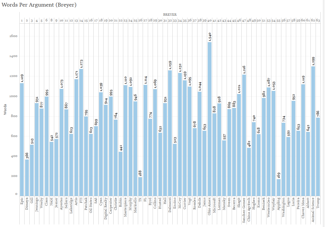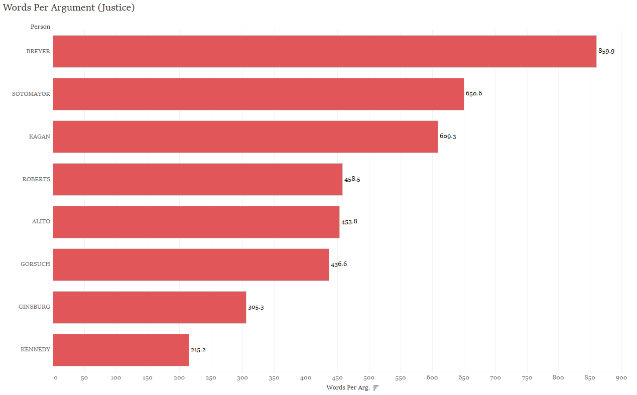 Breyer alone had more arguments with at least 1,000 words than the rest of the justices combined. He also had the most words in an argument this term in the American Express case. Justice Sotomayor had the second most words in an argument in Masterpiece Cakeshop.
