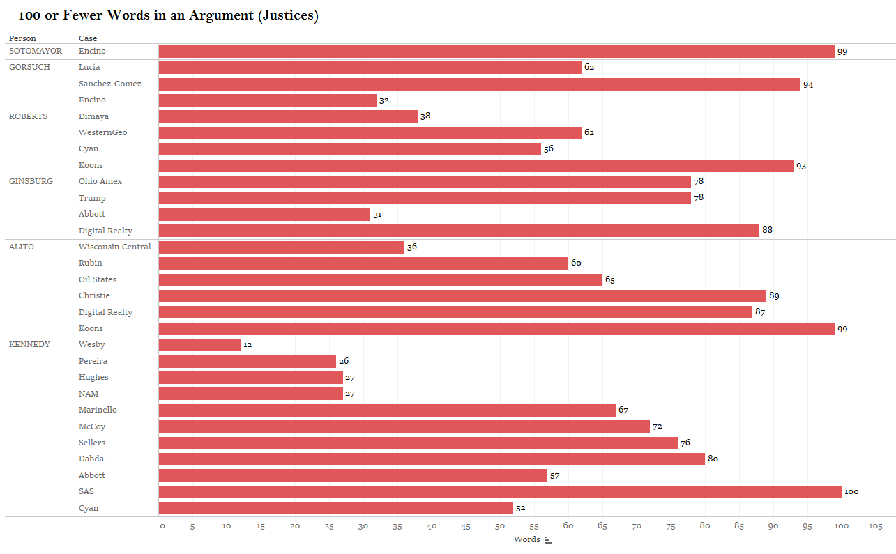 Not surprisingly given his low output across the entire term, Justice Kennedy had the most such instances among the justices. Still, five other justices are also covered in this figure and the only justice in this figure with just one instance of 100 words or fewer in an argument is Justice Sotomayor. This goes toh show that the justices (possibly with the exception of Justice Breyer) put a disparate amount of energy into various oral arguments, and that Justice Kennedy pensively chooses when to engage.