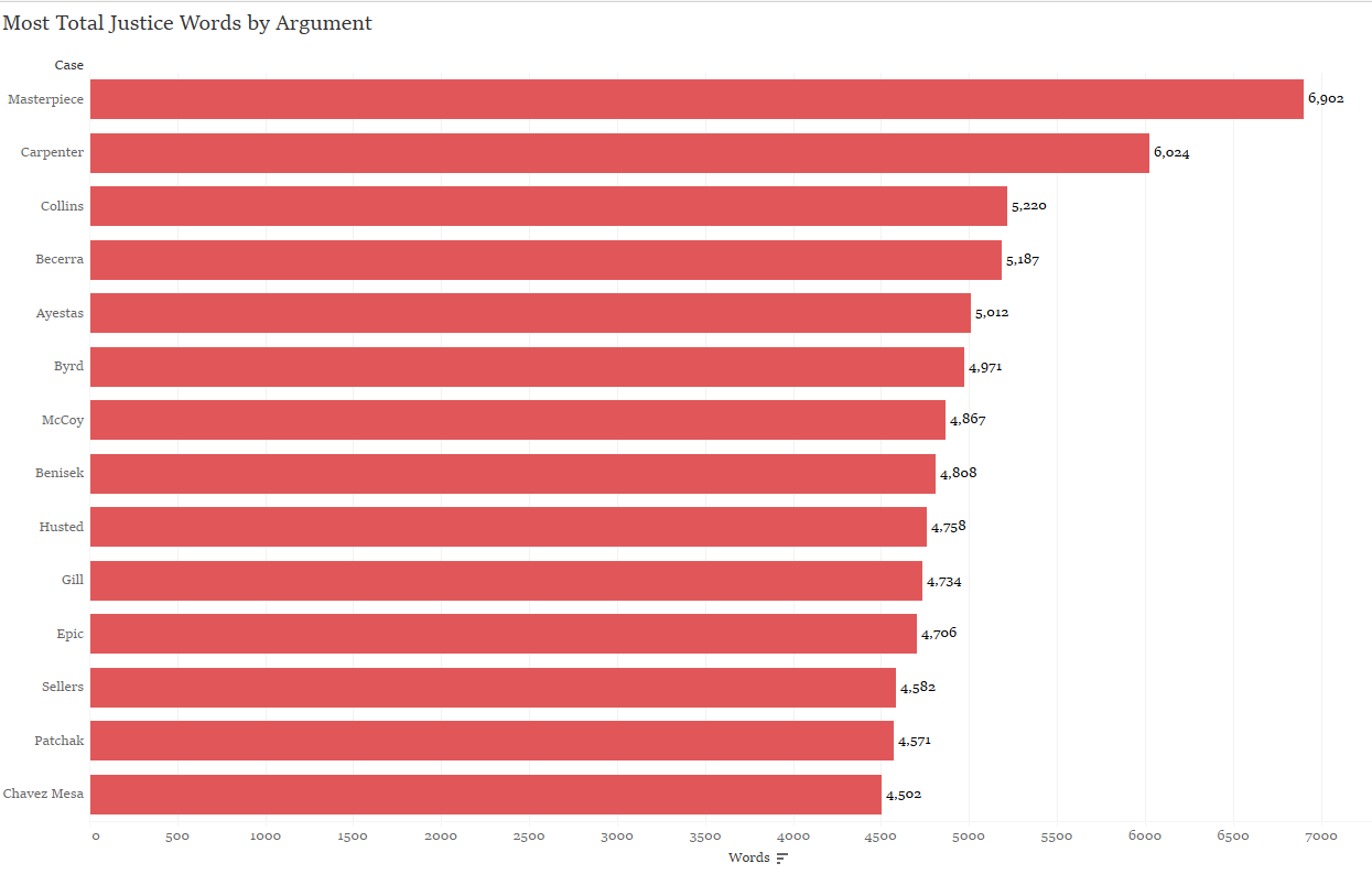 The number of words spoken was at the high end in Masterpiece Cakeshop and Carpenter, two of the more heavily anticipated cases of the term, while it was minimized in cases at the opposite end of the spectrum like Hamer and Rubin.