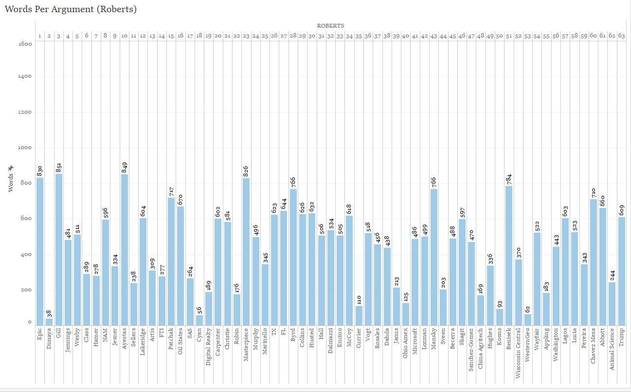 While less active across the board and with no 1,000 word arguments, Roberts was fairly consistent in his participation at either a moderate or low level during most oral arguments.