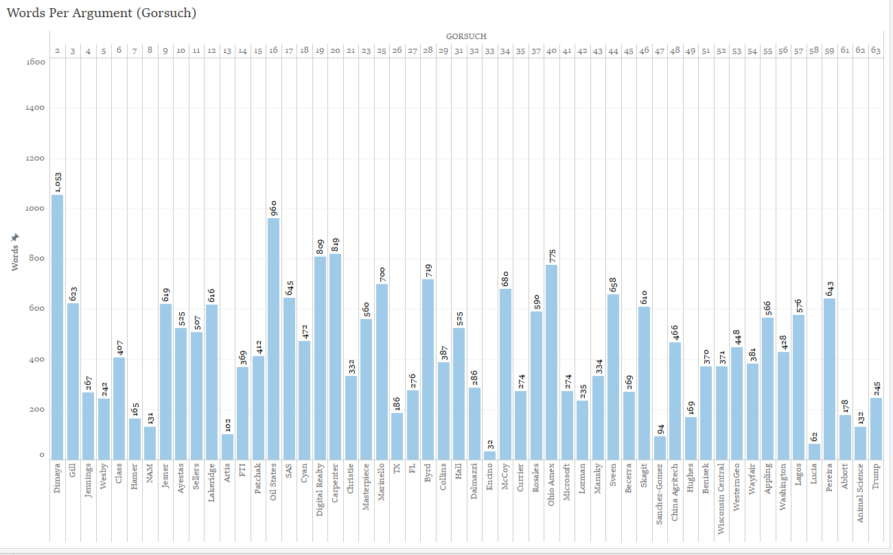 This juxtaposition might have been most apparent at the beginning of the term where Gorsuch did not speak at all during the Court’s first argument of the term – Epic Systems – and then spoke more than he did in any other argument this term in the next argument – Dimaya. Although Justice Gorsuch hovered around 100 words or fewer in a handful of arguments this term he was one of the most vocal contributors in several of the term’s most important cases including Oil States and Carpenter.