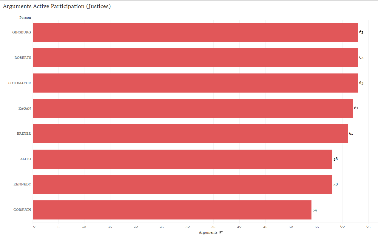 Unlike particular attorneys, Supreme Court justices are engaged in each oral argument over the course of the term. Even the reticent Justice Thomas is often caught perusing briefs while on the bench. Still not all justices are equally engaged and their type of engagement varies as well.