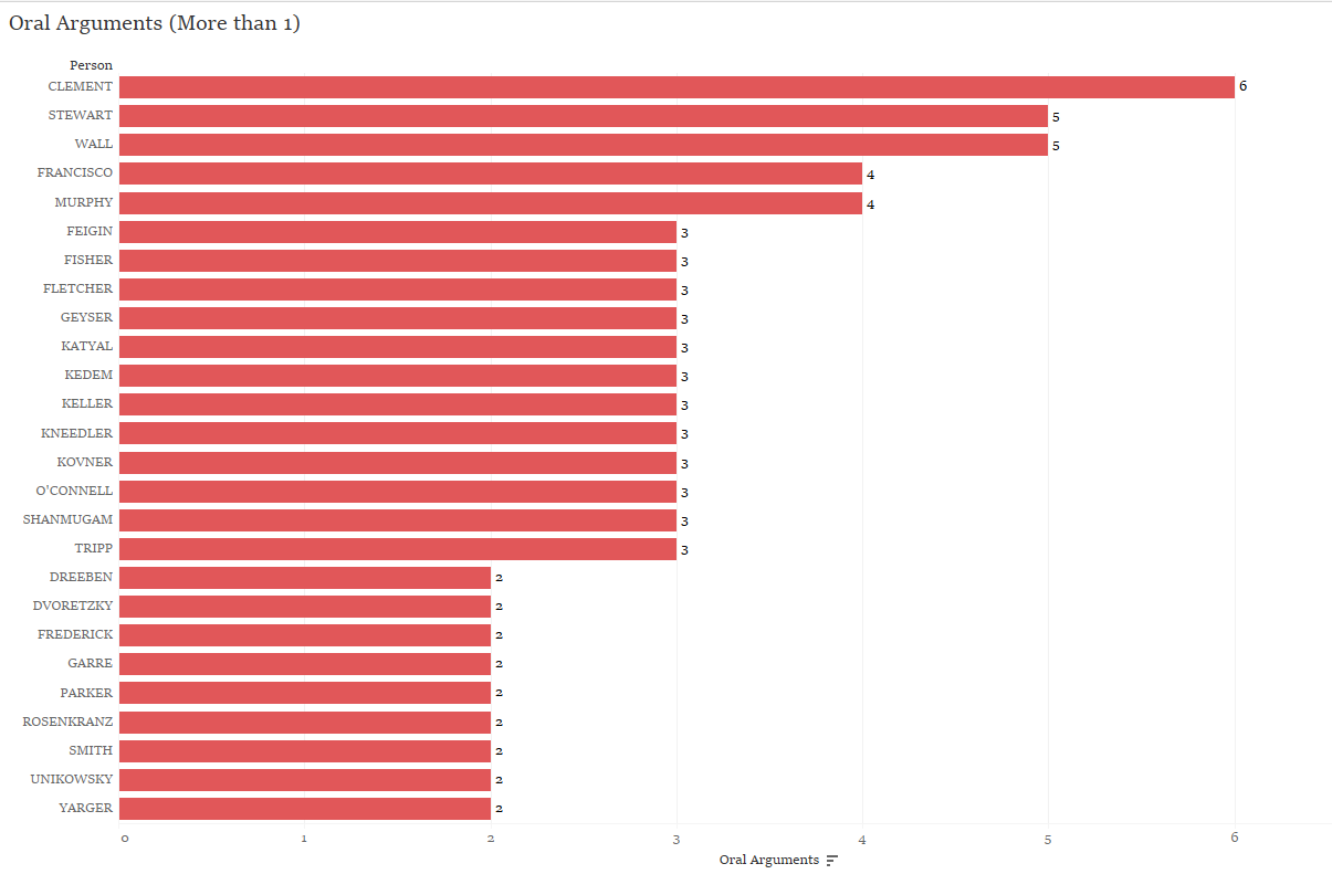 Private attorney Paul Clement participated in the most oral arguments followed by government attorneys Jeffrey Wall and Malcolm Stewart. Even though individual attorneys only participated in a modicum of arguments across the term compared to the justices, some were able to contribute quite significantly in these limited instances.