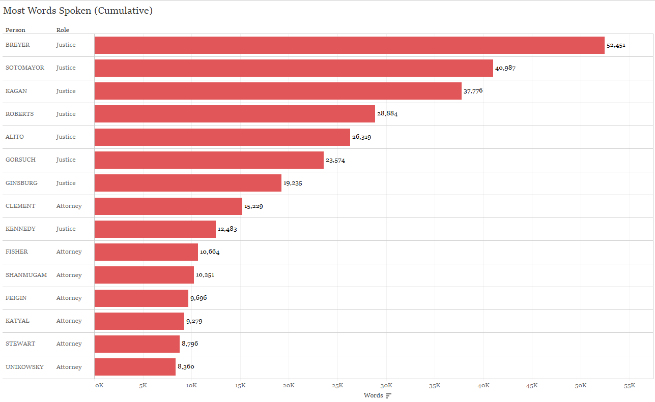 Looking at this question a bit differently, we can also order the advocates based on the greatest word-contributions in terms of words spoken in individual arguments. This analysis is detailed below.