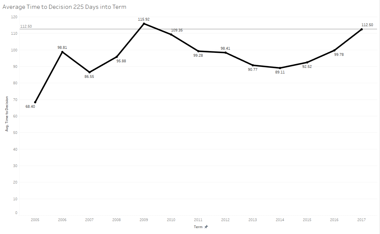 Today marks the 225th day of the 2017 Supreme Court term. The Court compensated for a slow term so far with five new decisions. Even with decisions in cases Murphy v. NCAA, Dahda v. United States, Byrd v. United States, United States v. Sanchez-Gomez, and McCoy v. Louisiana, the Court is still behind its output every other year under Chief Justice John Roberts. Counting the output from days since the first oral argument of the term seems the most appropriate way to normalize the Court’s output rate across terms. This figure shows where the Court stands now in terms of decision output and how this compares to all of the terms starting in 2005.