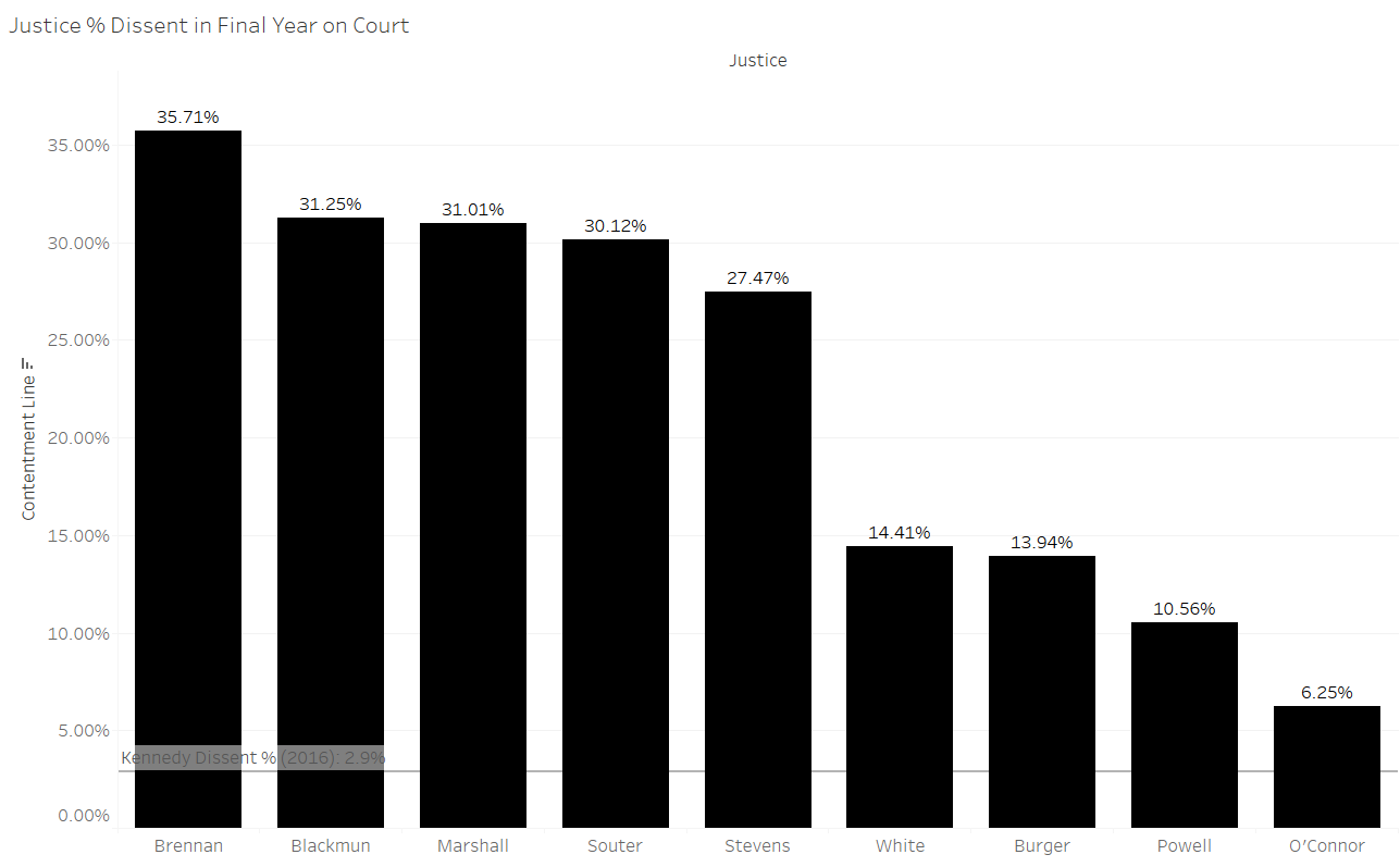 The figure above uses a 50% dissent in cases decided by one vote demarcation for satisfaction. As with much of the data on the retirees, there is a clear distinction between liberal and conservative justices. The majority of the Court has been conservative since the early Burger Court and so all of the justices examined in this post retired from a Court with a conservative majority. The liberal voting justices in the figure above dissented more than 50% of the time in cases decided by one vote in their final terms, while the more conservative justices are all below the 50% line. Justice Kennedy though is the only justice to not dissent in a final term (2016 is the last completed term and so it is the basis for this analysis of Justice Kennedy but note that Justice Kennedy has already dissented in two such decisions for the 2017 term – Dimaya and Artis.)