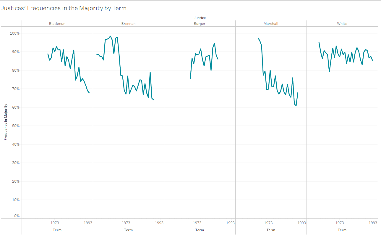 Justice Kennedy’s frequency in the majority has hovered at about the 90% level across his career on the Supreme Court. The more liberal justices’ frequencies tend to fall well below this marker while the more conservative justices are all in a similar range.