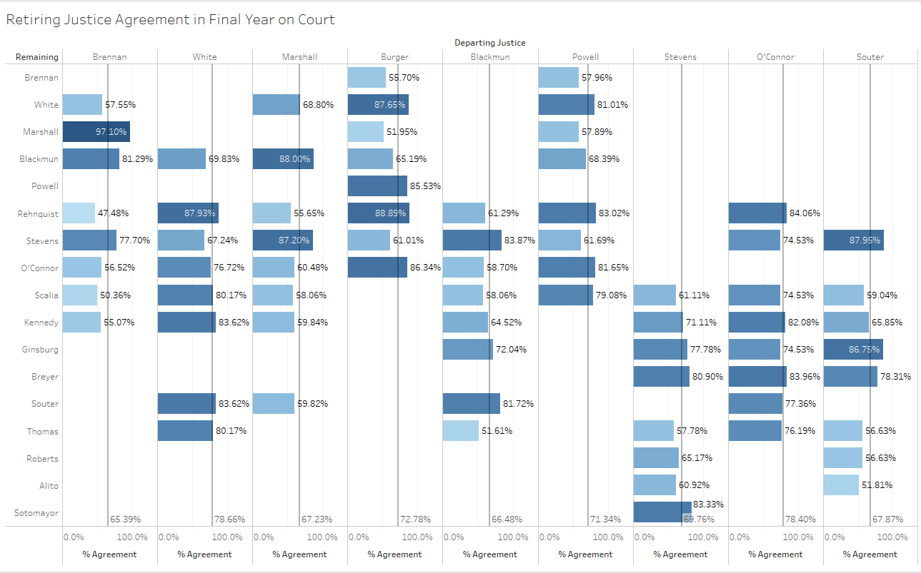Looking at the retiring justices’ agreement levels with the other justices on the Court in their final terms shows a similar distinction between more and less contented justices. Note that the darker bars in the figure below correspond with higher agreement levels and the gray lines are the retiring justices’ average agreement levels for the term.