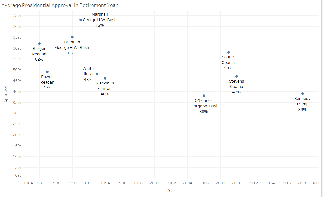 If Justice Kennedy were to retire right now, he would retire under the second lowest average presidential approval level for the justices measured in this post as only President George W. Bush’s approval rating in 2006 was lower. The rest of the justices retired under presidents with at least a 40% average approval rating in the justice’s final year suggesting a potential albeit tenuous relationship that may factor into a justice’s calculus.