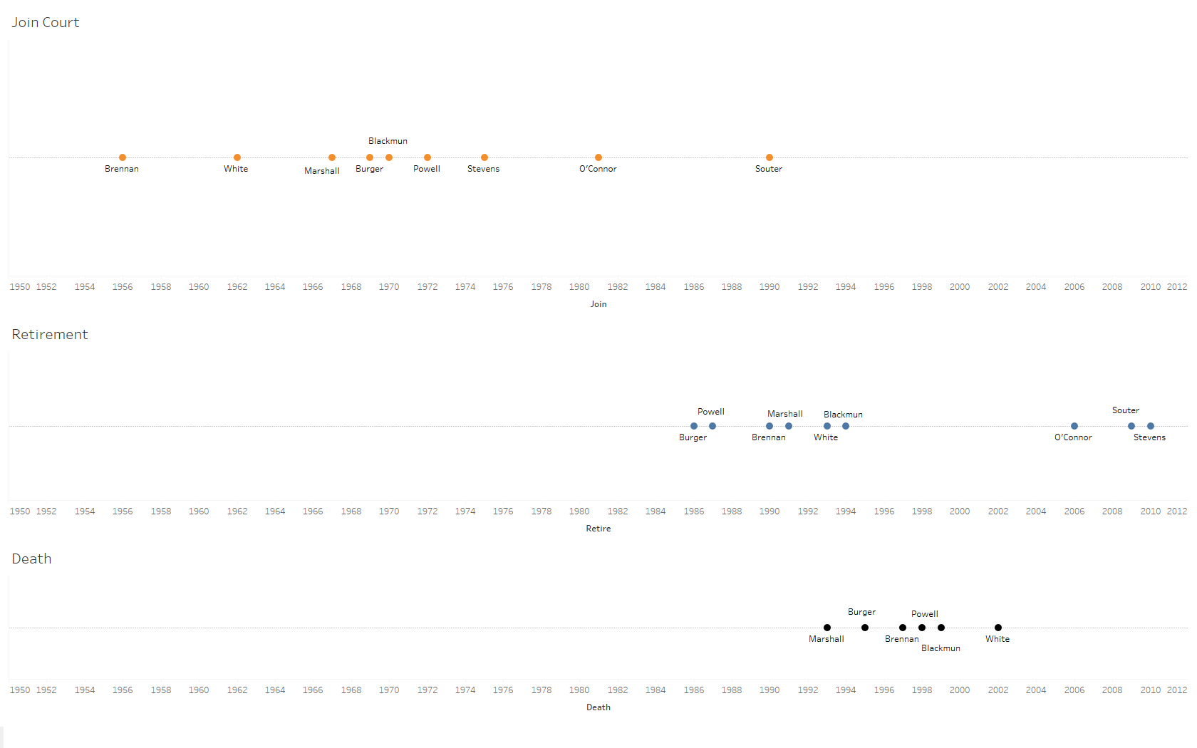 To probe a bit deeper, how better to get a sense of the likelihood that Justice Kennedy departs than by looking at the Court’s previous retirees? Nine justices retired between and including Justice Burger in 1986 and the most recent retirement of Justice Stevens in 2010. The figure below looks at three timelines that track when these nine justices joined the Court, retired, and passed away for those not still living.
