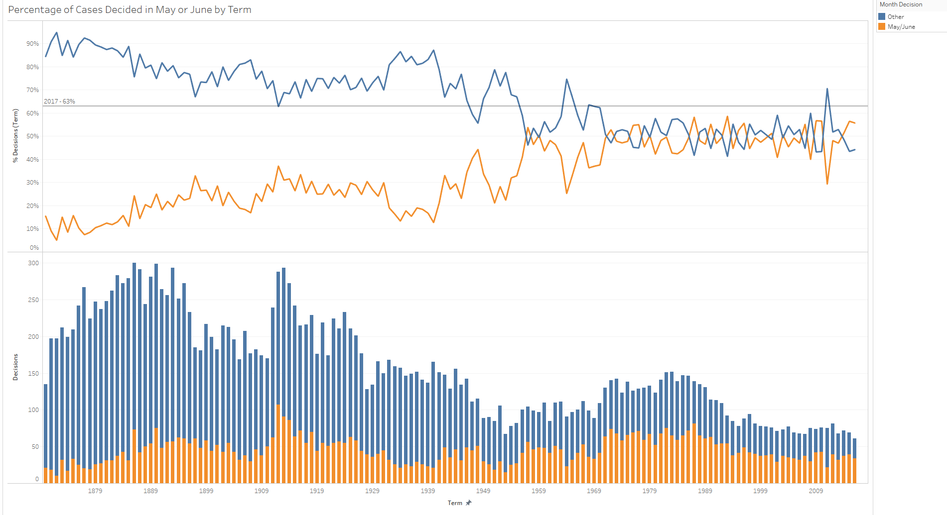The following figure provides further evidence that the Court was dilatory in releasing its opinions compared to years past. On the top it shows the percentage of cases by term that the Court decided in the last two months of the term compared to the cases decided at any other time during the term. On the bottom the bars show the raw counts behind these percentages.