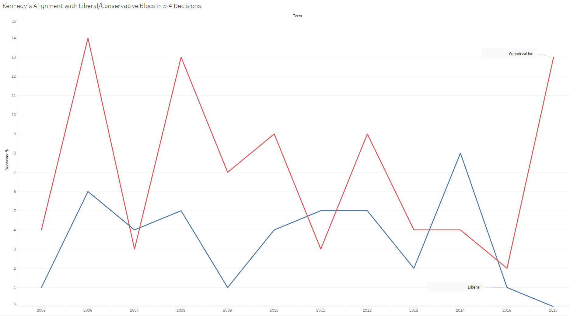 This partisan split on the Court though was a recurrent theme this term. 13 of the 18 decisions that split the justices votes five to four were decided by the five more conservative justices in the majority. As Kennedy did not side with the more liberal justices once in such decisions this term, the conservative justices found themselves time and again in control of majority opinions. This disparity in voting was actually unique for Kennedy in the Roberts years for cases. The graph below shows the number of times Kennedy aligned with the more liberal and more conservative coalitions in 5-4 decisions since Roberts joined the Court in 2005.