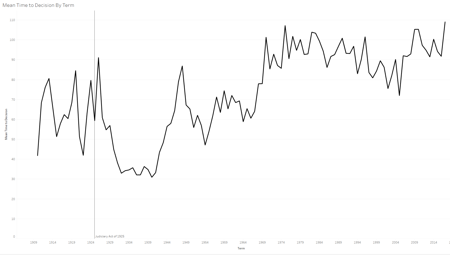 This image problem may well have led to the Court’s slow pace in releasing decisions this term. Below is a look at the average time between oral arguments and decision by term since before the Congress made certiorari the main mode of getting cases to the Court with the Judiciary Act of 1925.