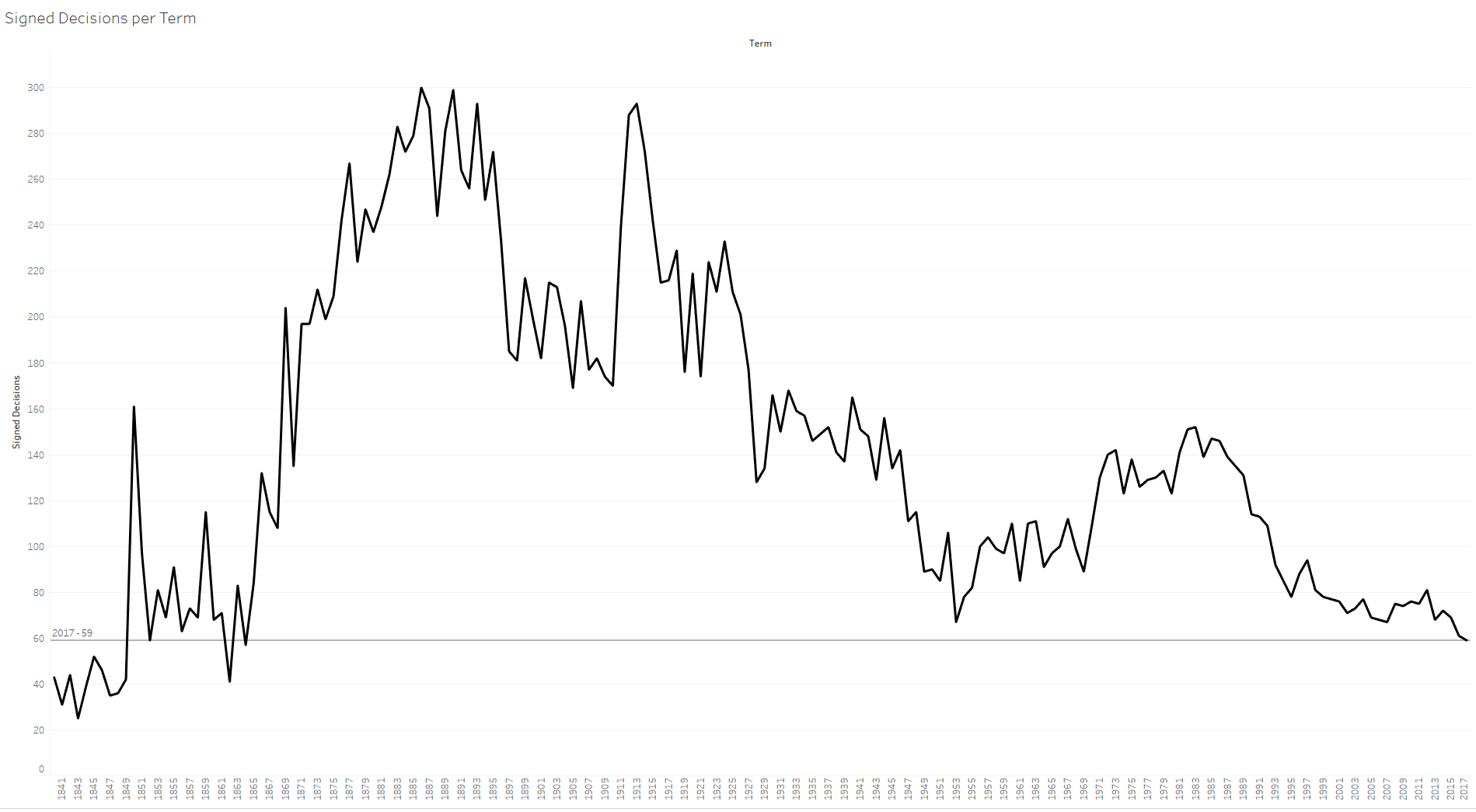 The Court, however, decided fewer cases this term by signed decisions than it has since the Civil War as the next graph shows.
