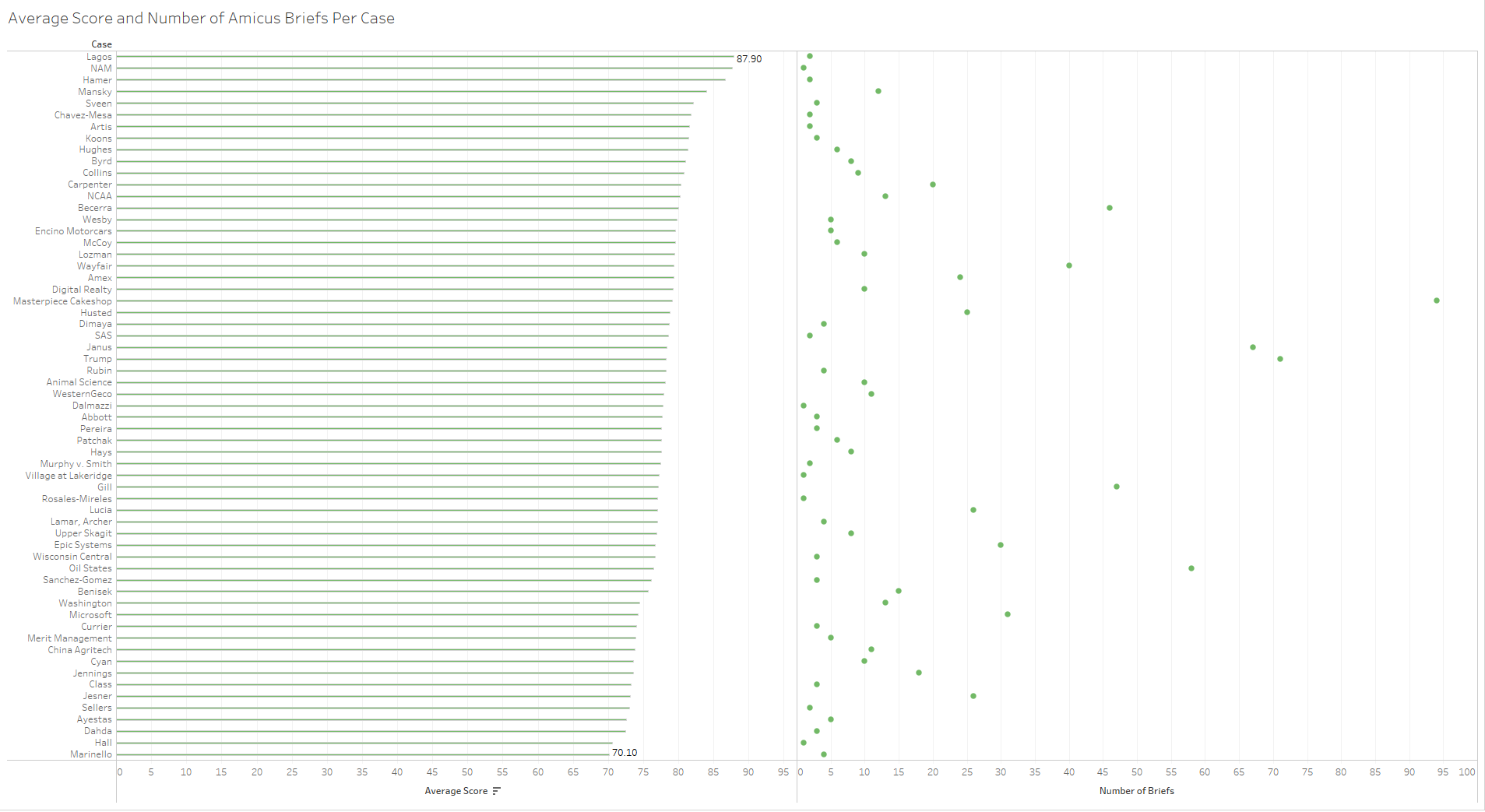 These composite BriefCatch scores were then used to make comparisons between briefs and between groups of briefs. To start we can look at the scores on a case-by-case basis. The following shows the number of amicus briefs evaluated for each case this term and the average composite scores across all briefs by case.