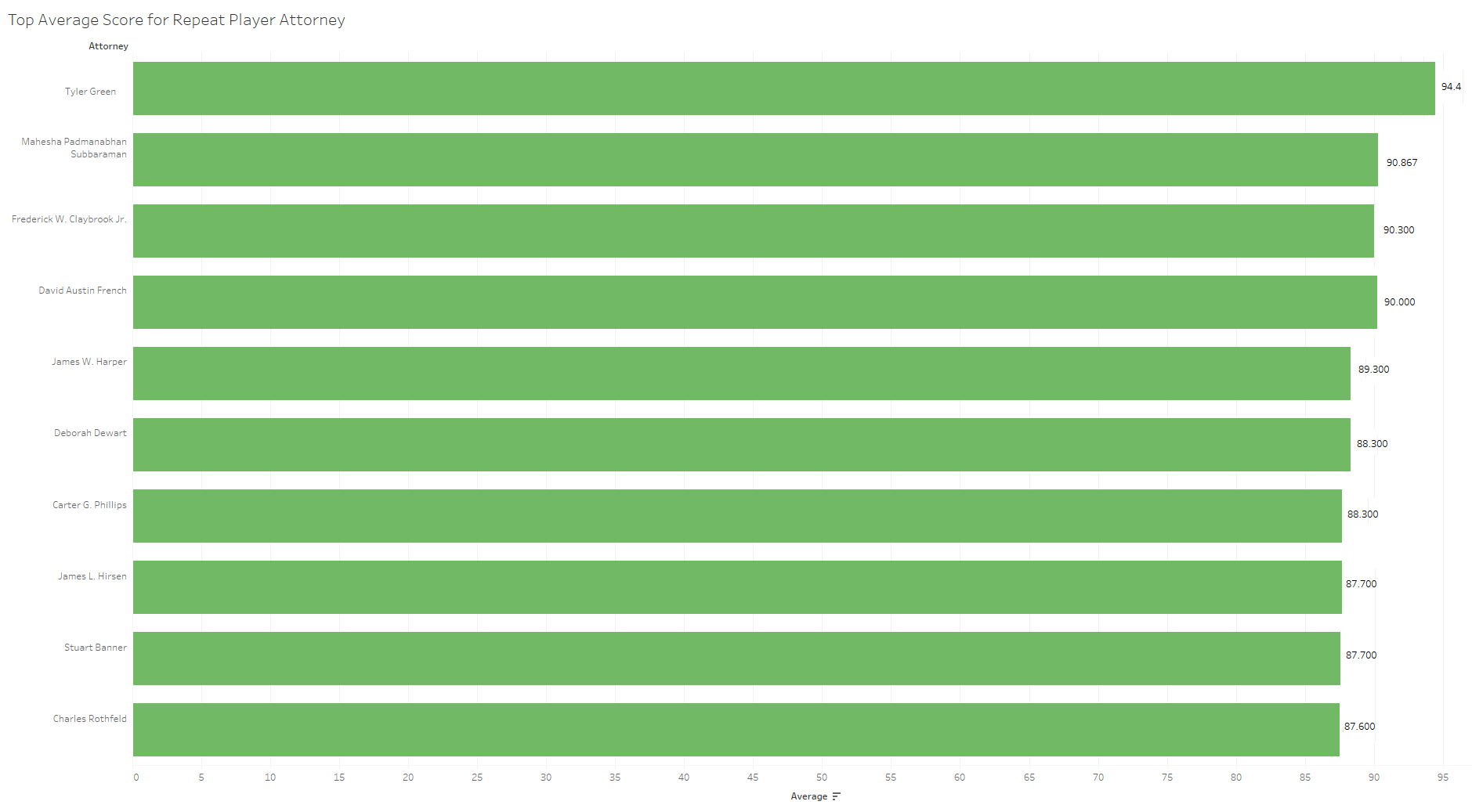 Next, these average scores by case are disaggregated into individual briefs’ scores. The following figure shows the top-rankedbriefs from the term. All of these briefs had average scores greater than 91.5 and when referring back to the previous figure, fall to the right edge of the distribution.