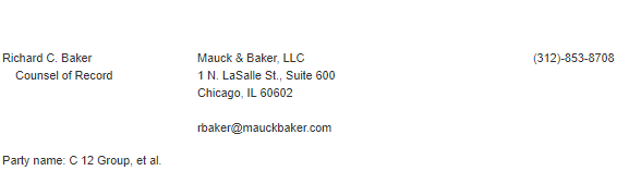 To the right of the attorney is their law firm or place of practice, Mauck & Baker in this instance, and below is the name of the group on whose behalf the brief was filed, here C 12 Group, et al. The docket usually contains the name of the first listed firm and group and tends not to include multiple entities even if they appear on the brief itself.