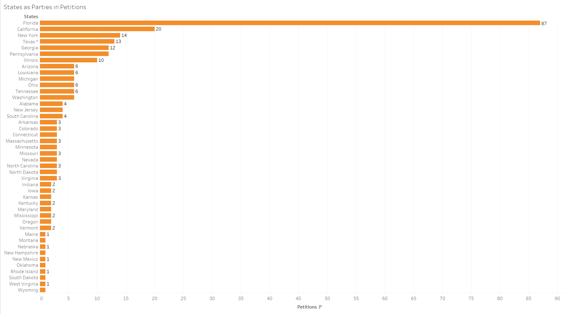 No state comes close to Florida in terms of number of petitions, not even California, New York, or Texas. Texas has an asterisk next to it because these 13 petitions are also buffered by the petitions against Texas prison officials.