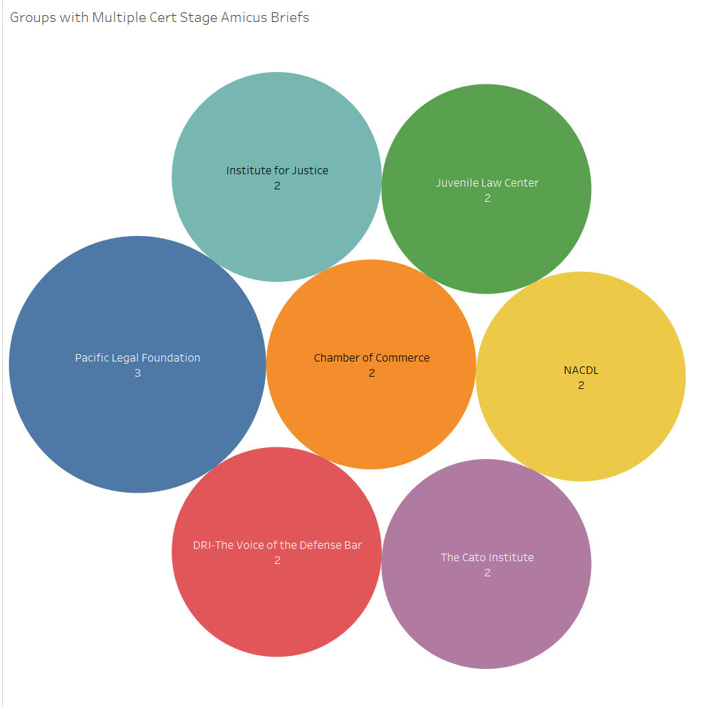 Several groups that tend to file multiple Supreme Court amicus briefs at the cert stage and on the merits each term each filed two cert stage amicus briefs that were included in the data. These groups are some of the Court’s most effective amicus filers. Only one group, the Pacific Legal Foundation has three amicus filings though in cases that will be examined in the long conference. These filings are in the California beachfront easement case Martins Beach 1 v. Surfrider Foundation, the case Fleck v. Wetch, which challenges states’ practices of forcing attorneys to join government run bar organizations before practicing law in those states, and the arbitration related case Gerawan Farming v. Agricultural Labor Relations Board.