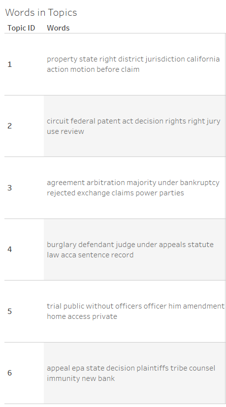 Each of the topics could be given titles to help with categorization. Topic 4 for instance focuses on criminal law while Topic 6 seems to focus on agency actions. More about these topics can be assessed by locating the petitions which are most strongly associated with each category.