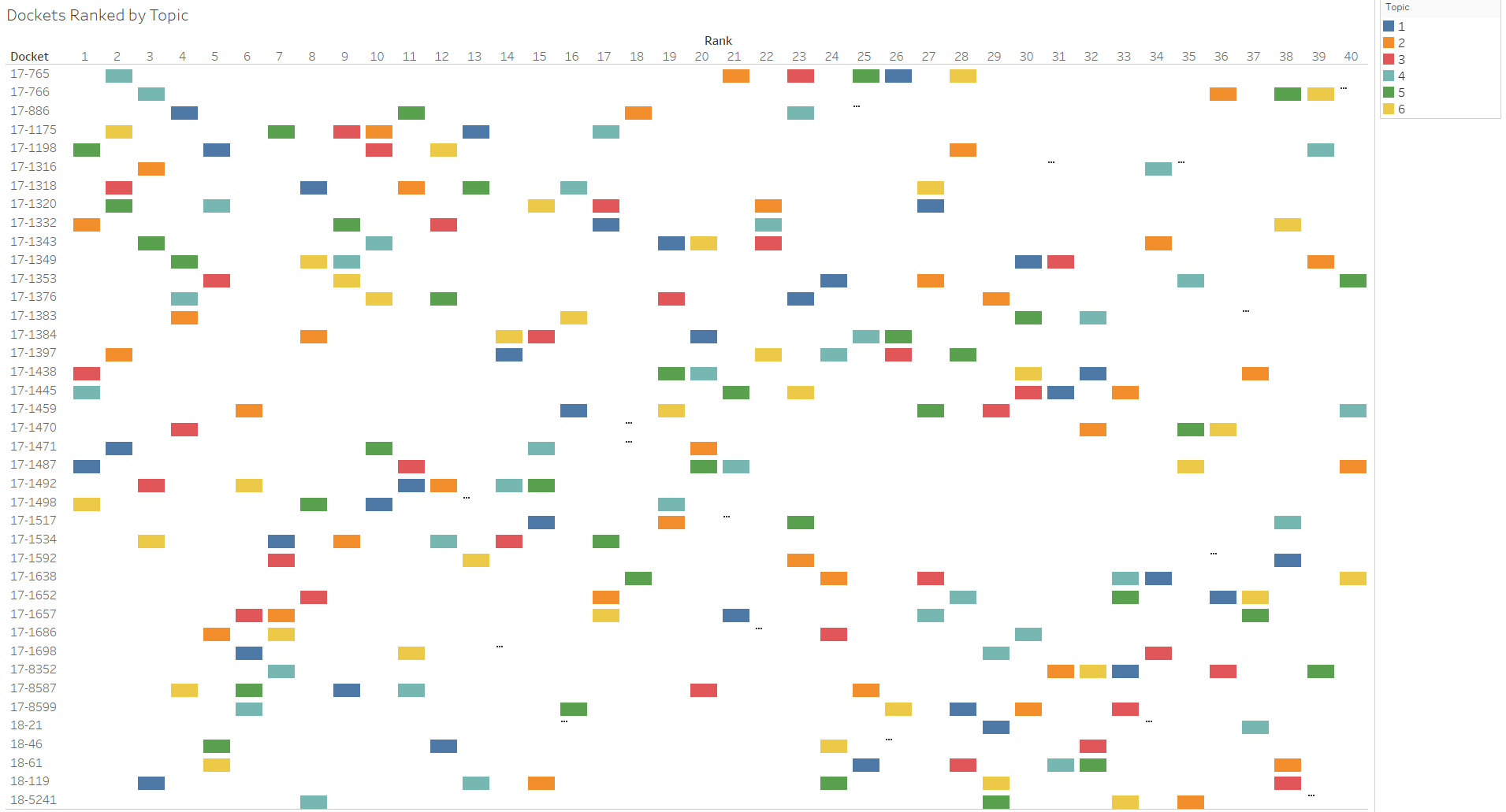 One way to do this is by looking at how strongly each petition is related to a topic relative to all of the other petitions in the set. The following figure shows how the 40 petitions line up according to each topic. The dockets are ranked 1-40 from most related to a topic to least related to a topic relative to the 39 other petitions.