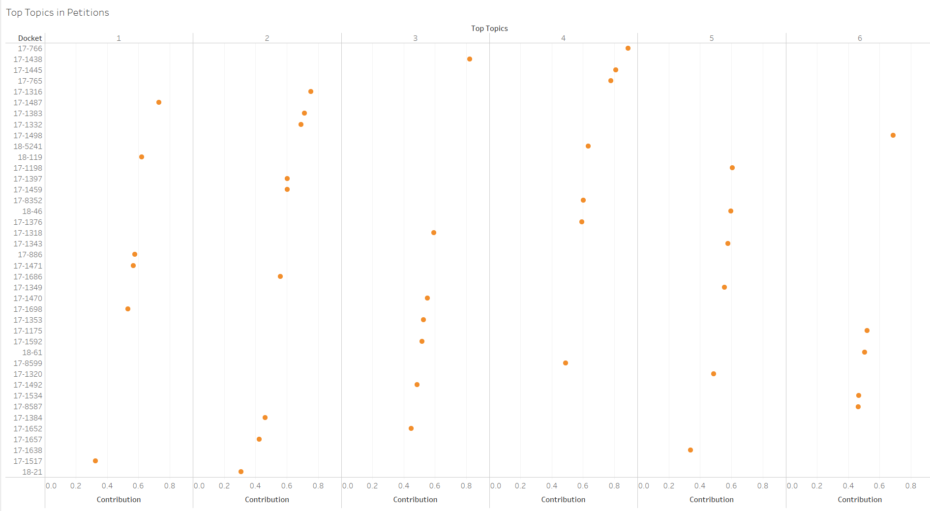 This ranking of petitions according to topic provides a hierarchy of cases but does not show the relative importance of a given topic to a given case. For instance, we might know that case A is stronger on Topic 1 than case B, but this tells us little about how important the topic is to either case as it only gives order to the set of cases. The unsupervised learning output also provides a metric of a document’s relationship to a topic showing the relative importance of each topic to each petition. The next figure shows the six petitions most related to each topic and how important each topic is to each of the six cases. The relative contribution of each topic to each petition is given by a value between zero and one.