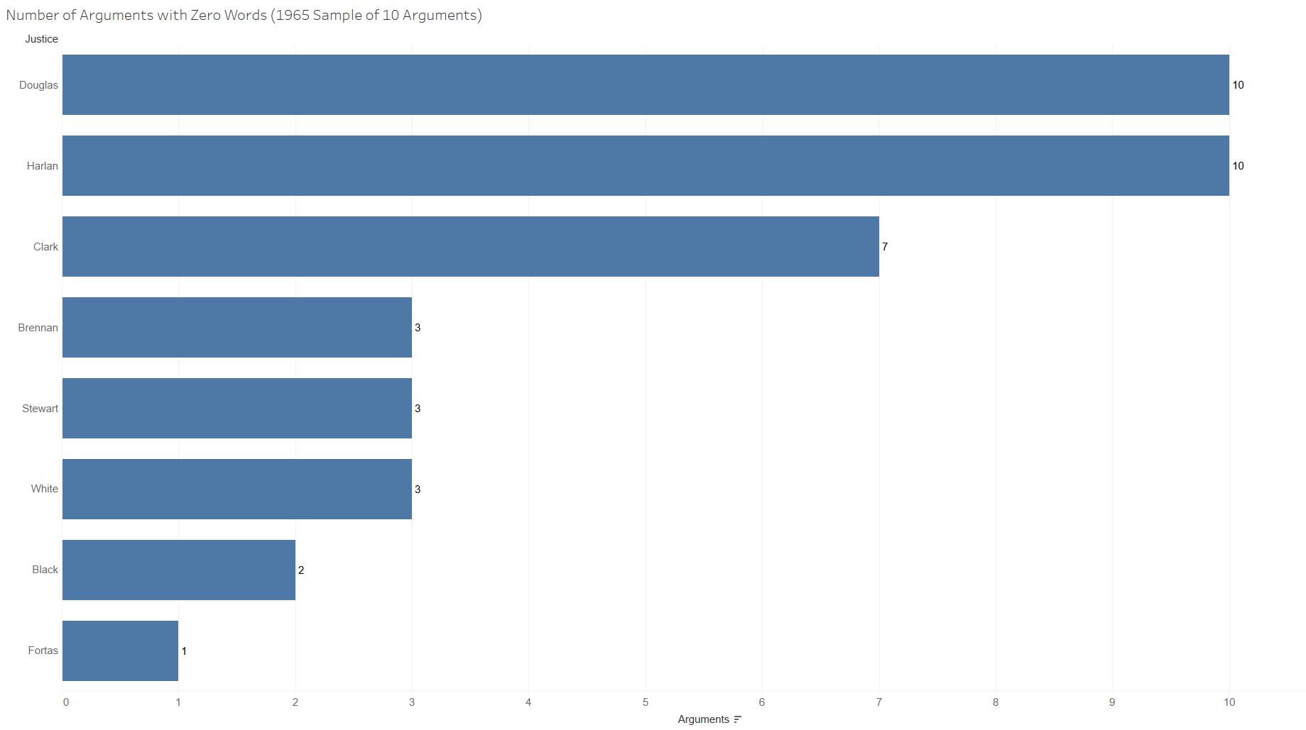 Brennan, Blackmun, Powell, and Marshall each were silent for multiple arguments in the 1979 and/or 1989 terms. When we push back to 1965, a full 42% of the 90 justices’ argument slots were silent including all ten from Douglas and Harlan.