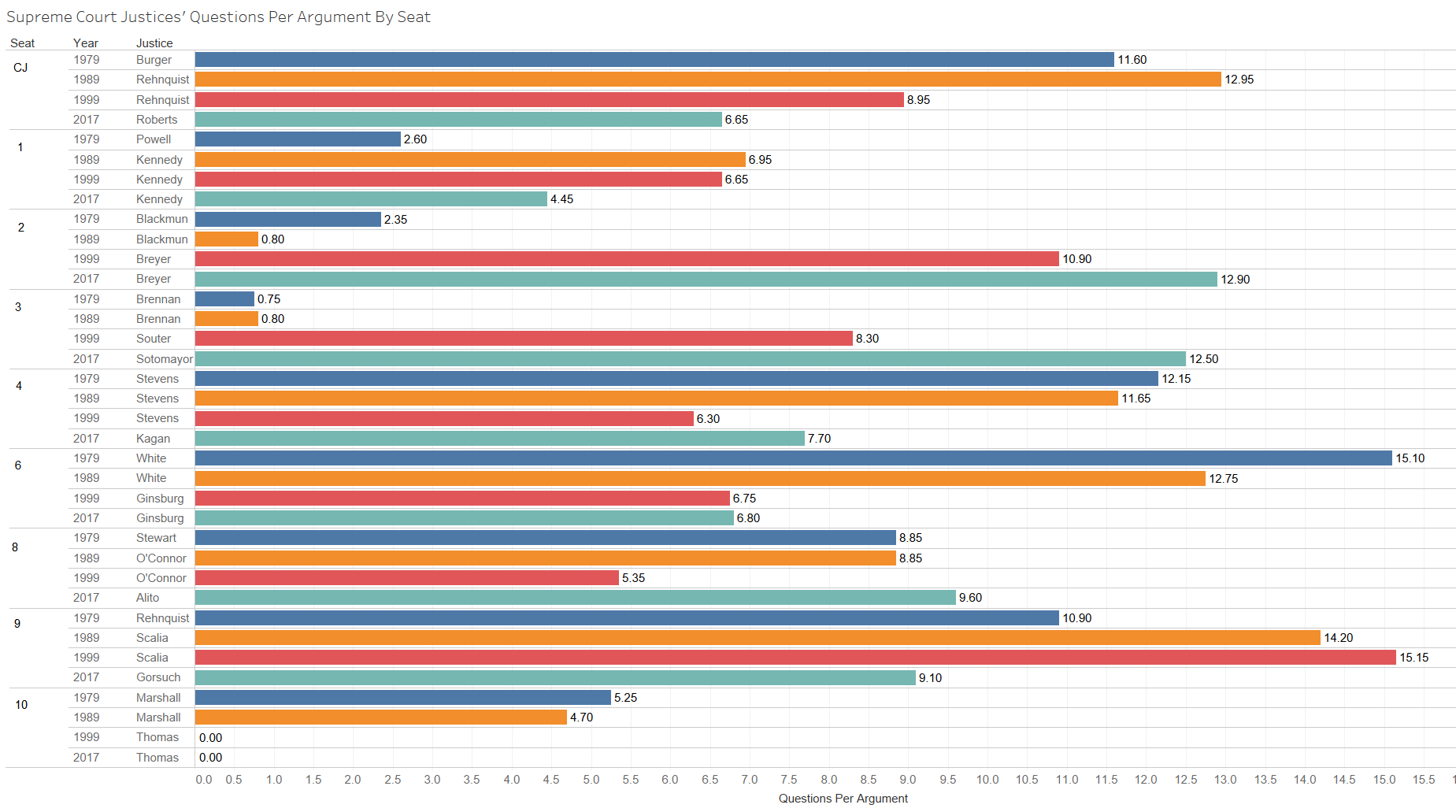 Along with Thomas, Gorsuch, and Roberts, Ginsburg asked fewer questions on average than White, and Kagan asked fewer questions than Stevens.