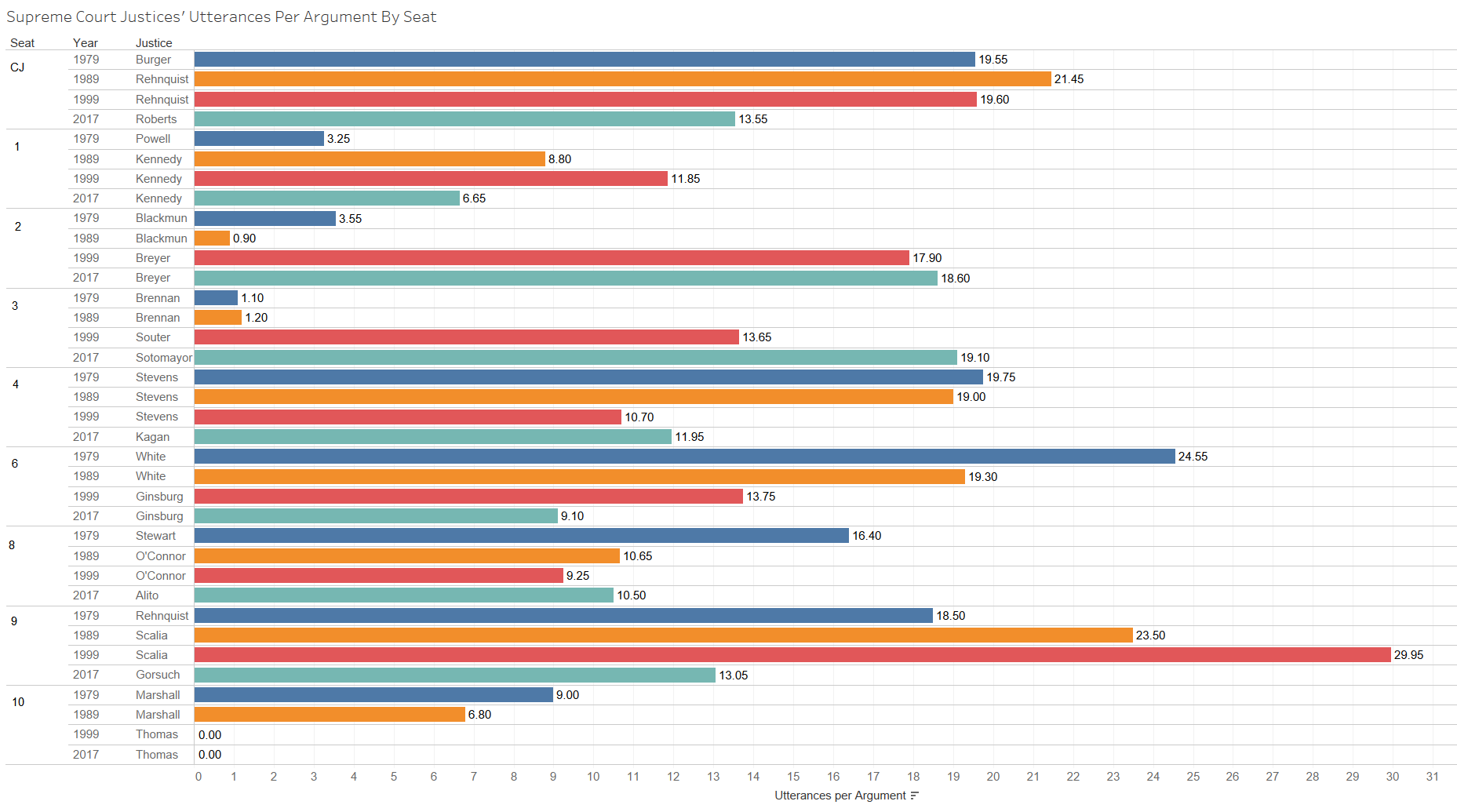 Only Fortas was in the range of average words per justice/argument for a modern justice. When we look by the justices’ seats we also see that the justices generally said more in the more recent terms.