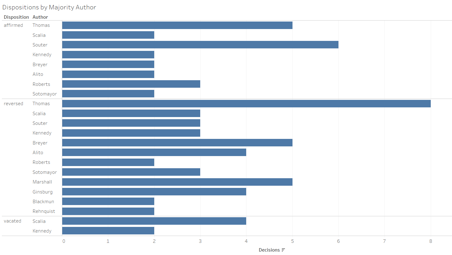 Justice Thomas, who has had more majority opinions in this set of cases than any of the other justices with 15 also leads in reversals with eight. Justices Breyer and Marshall have the next most with five each while Scalia leads in decisions vacating the lower court’s rulings with four. Justice Souter who has the second most majority opinions in this set of cases after Thomas with ten leads in affirmances with six or more than half of his majority decisions in these cases. Thomas comes in next with five although his ratio of reversals to affirmances is much more reversal heavy.