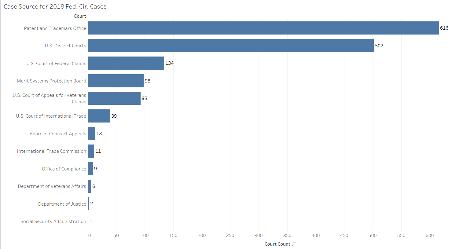 In 2018, the Federal Circuit took cases from 12 different types of lower courts (with federal district courts aggregated as one court type) as is displayed below: