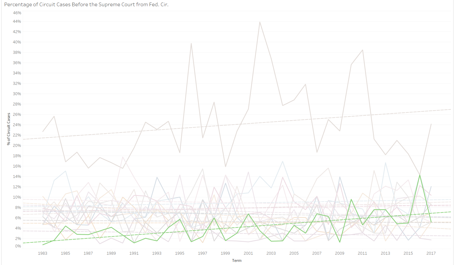 In the figure about each dotted line represents the trend of docket percentage for a federal appeals circuit. The green dotted line marks the Federal Circuit’s trend. While the federal circuit’s line slope is increasing in this graph, many of the other circuits’ trajectories are flat or declining.