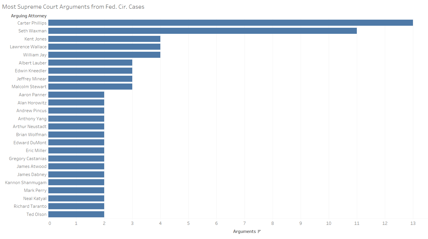 Since the subject matter of cases before the Federal Circuit tends to be fairly specific, certain lawyers have gravitated towards trying these cases on appeal. In many instances, Supreme Court experts like Carter Phillips and Seth Waxman take cases tried by other attorneys in the Federal Circuit. The attorneys that have argued the most Federal Circuit cases that later made their way to the Supreme Court are shown below:
