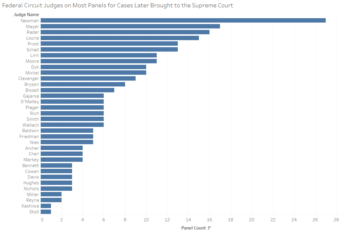 Equally important in understanding the dynamics between the Federal Circuit and the Supreme Court is an assessment of the roles that Federal Circuit judges play in this system. Since the Federal Circuit is less than 40 years old, the number of judges that have sat on this court is small relative to most other appeals circuits. Several Federal Circuit judges have adjudicated substantially more cases that were later decided by the Supreme Court than others.