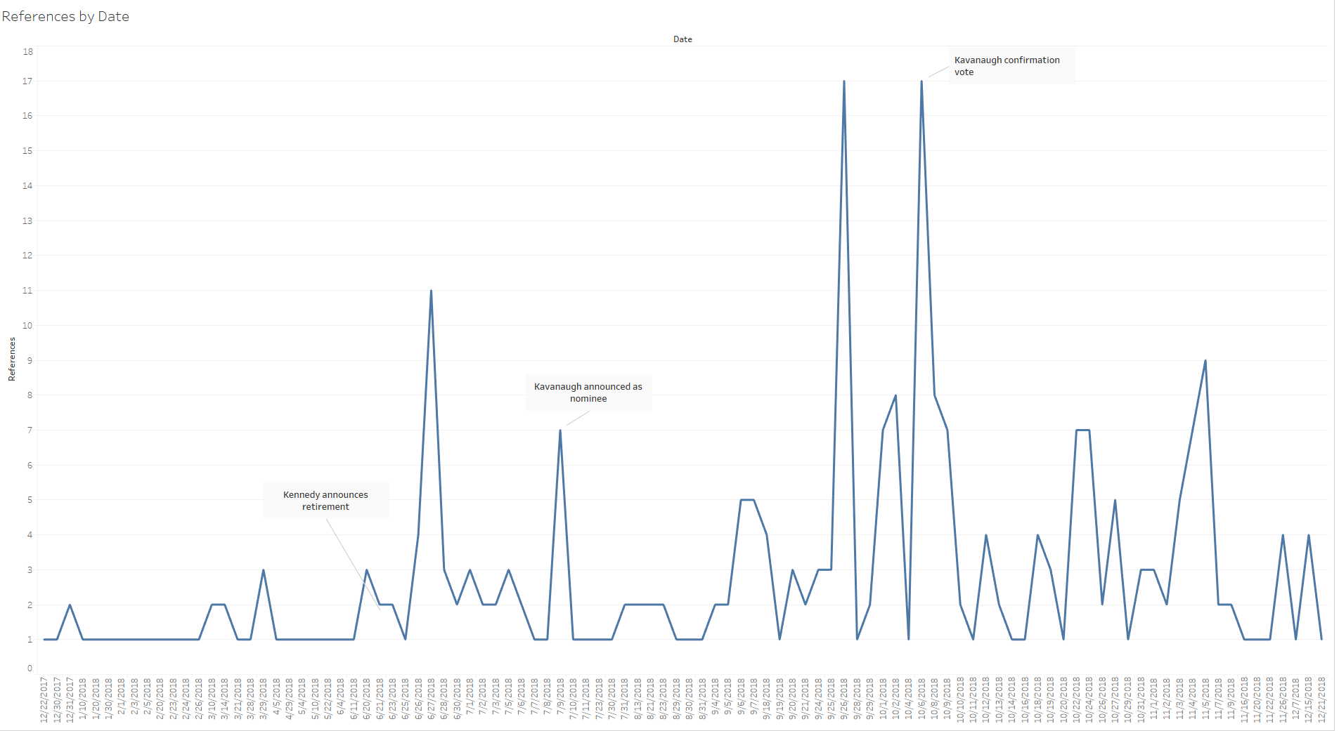 The various Supreme Court related events where Trump had a vested interest often coincided temporally with his comments. Overall and after eliminating duplicate observations, President Trump had some 280 public comments where he mentioned the Supreme Court between 12/22/2017 and 12/22/2018. The frequency of these references by date are displayed below.