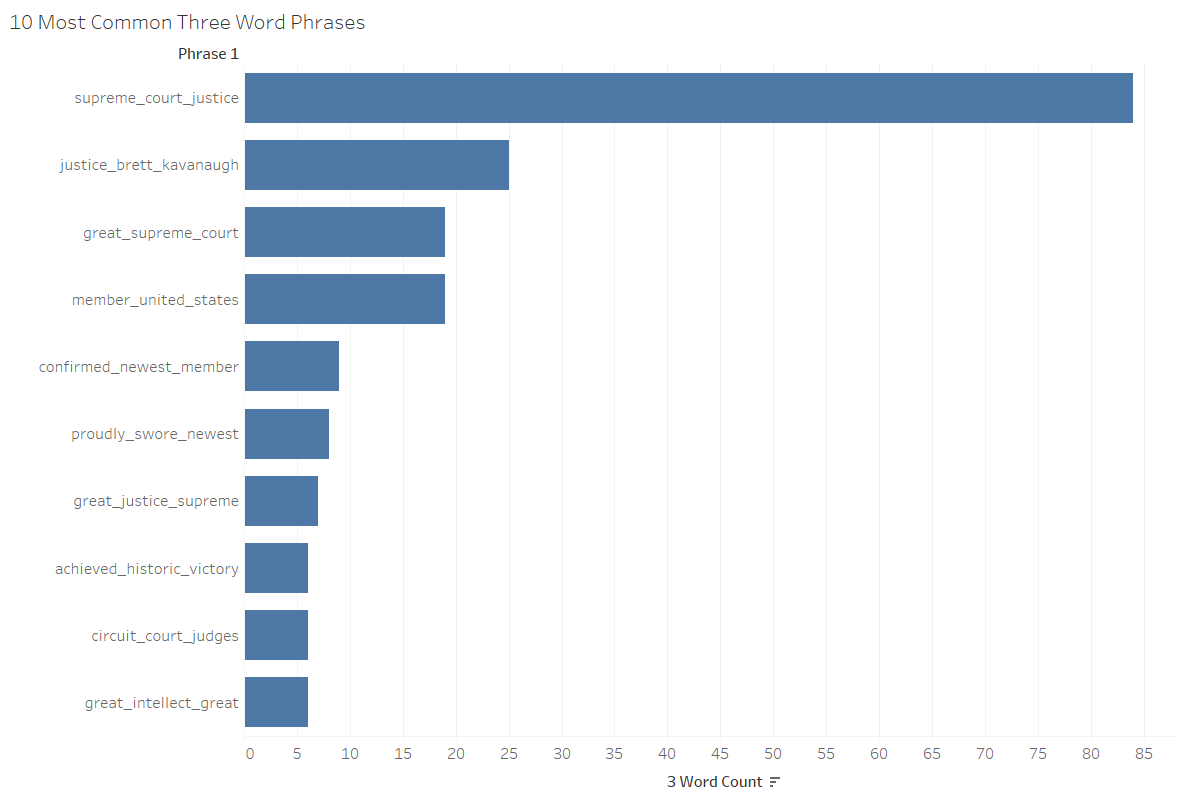 Many of these terms came during discussions of the Kavanaugh nomination and often took place during commentary on the confirmation hearings. Multiple word phrases provide greater context for Trump’s words surrounding the Supreme Court. The most used two-word phrases or bigrams are shown below.