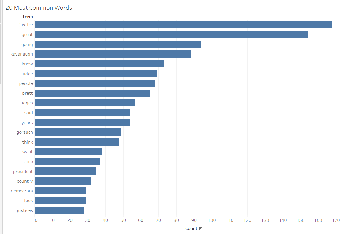 The size of the words relates to the frequency with which they appear in the data. The size of “Brett” indicates that Trump frequently referenced Brett Kavanaugh. Other words like “newest” and “Yale” also relate to Kavanaugh as he is the newest justice and a graduate of Yale Law School. Some of the words like “horrible” may require supporting prose to understand (Trump often described the Democrats treatment of Kavanaugh during the confirmation hearings as “horrible.”) Since both of Trump’s Supreme Court nominees were men, the term “man” came up quite frequently and is prominent in the wordcloud as well.
