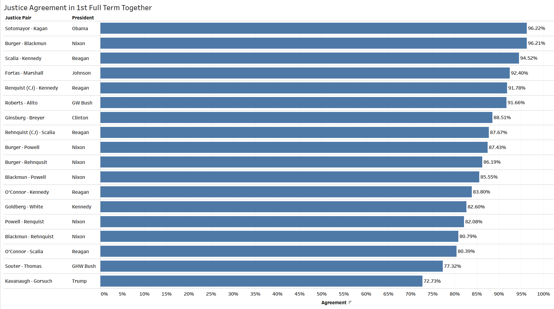 At 72.73% agreement though the Gorsuch-Kavanaugh pairing is almost five percentage points lower than the duo with the next least agreement, Souter and Thomas, and those two ended up on opposite ideological poles of the Court. While the same is not expected for Gorsuch and Kavanaugh, this early divergence may foreshadow downstream differences between the two.